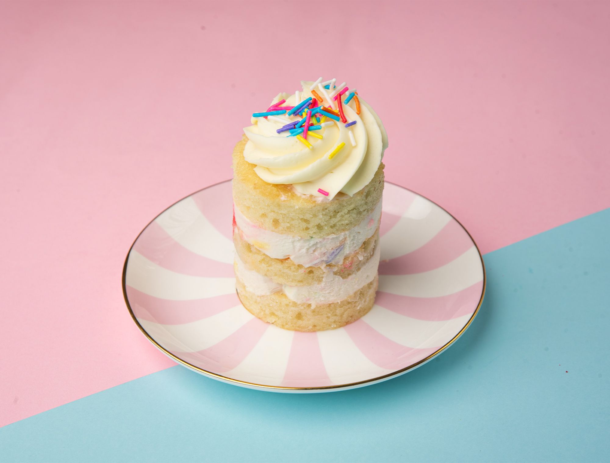 מיני קייק (קוטר 6 ס״מ) 3 שכבות עוגת וניל במילוי קרם וניל וספרינקלס צבעוניים.