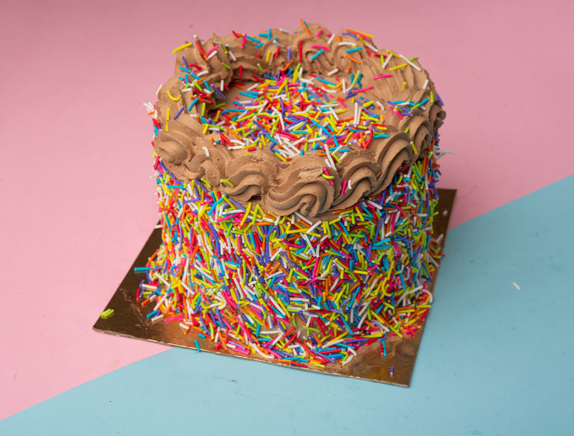 עוגת שוקולד עשירה, במילוי קרם שוקולד מוקצף וציפוי ספרינקלס צבעוני.