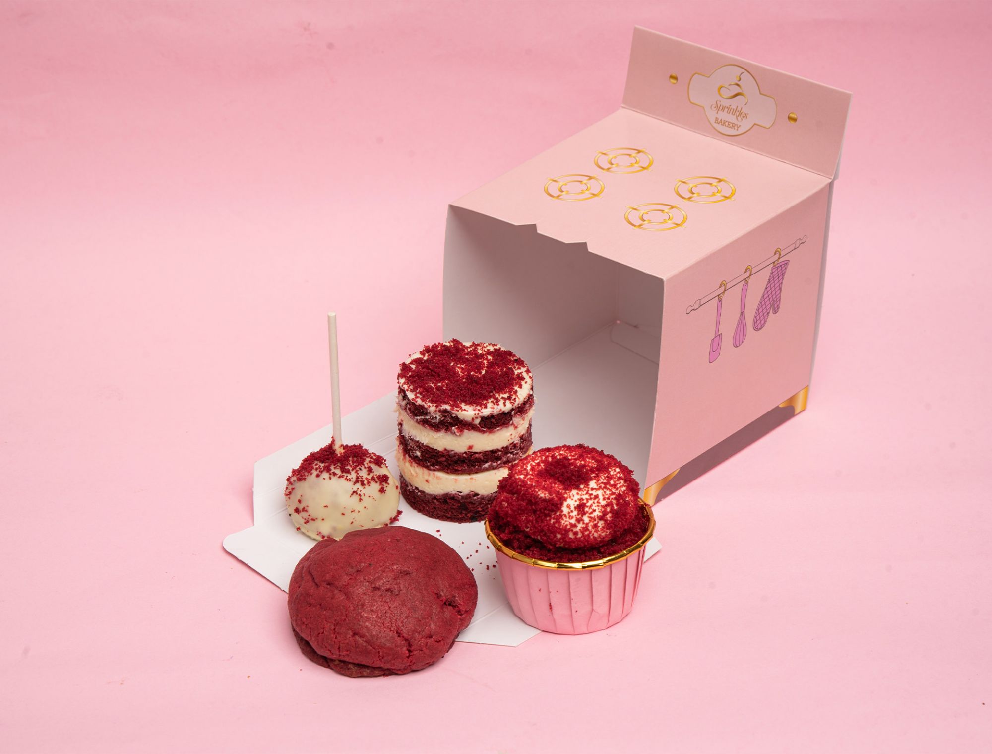 מארז רד וולט במילוי קרם צ׳יז עשיר המכיל: קאפקייק רד וולוט, עוגיית רד וולוט, קייקפופ רד וולוט ומיני קייק רד וולוט לחגיגה מושלמת.