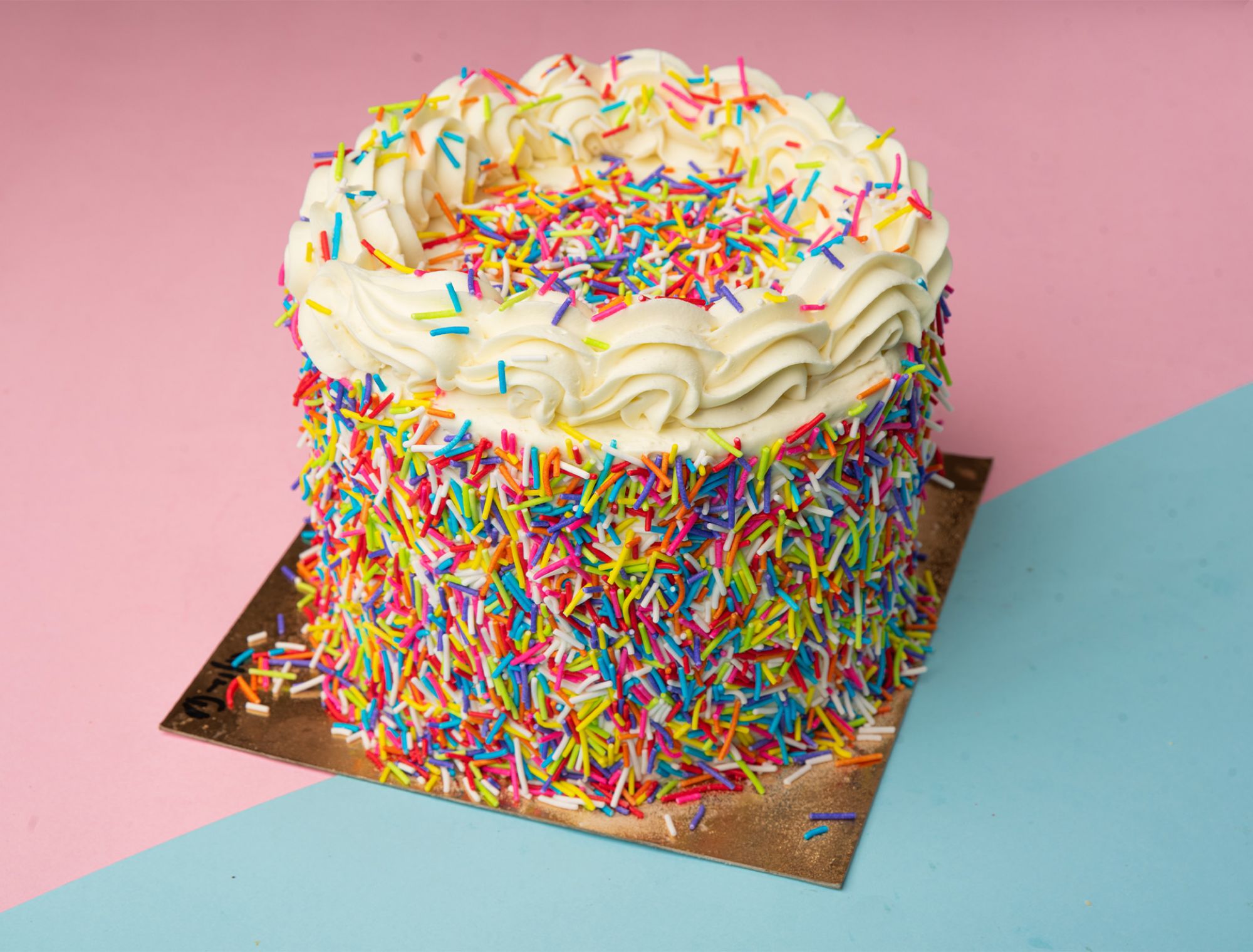 העוגה מצופה בקרם חלק ומעוטרת סביב בציפוי ספרינקלס צבעוני, עם קרם וניל מוקצף למעלה בגימור חגיגי ועדין.