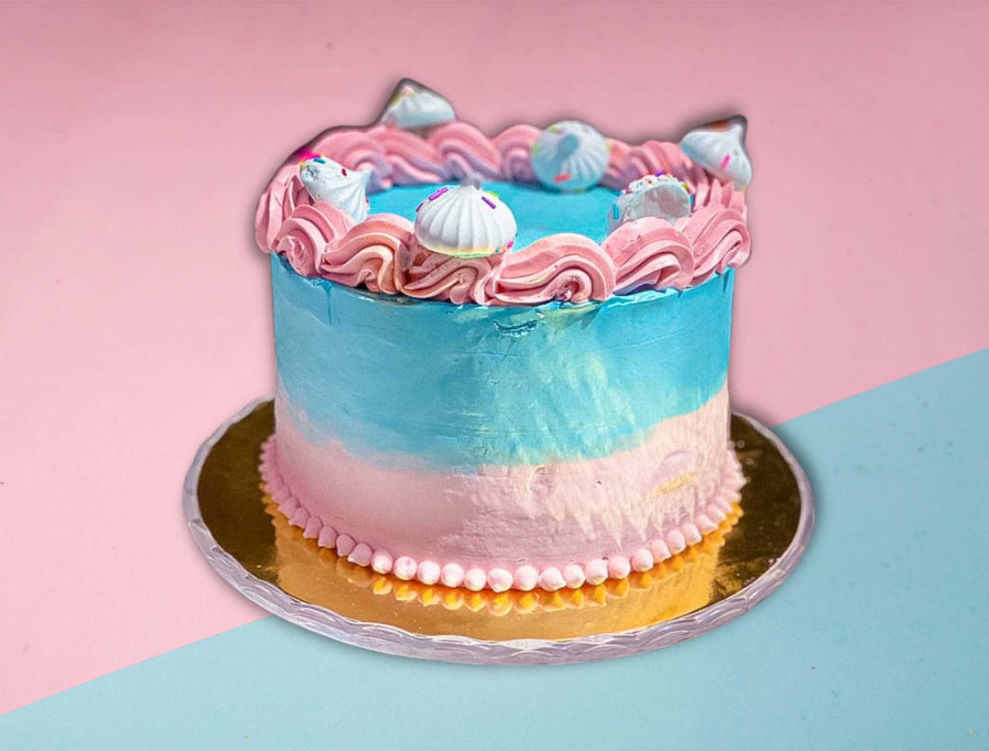בתוך העוגה מסתתרת הפתעה צבעונית – מילוי קרם בגוון ורוד או כחול, שמתגלה ברגע החיתוך וחושף את מין התינוק.
