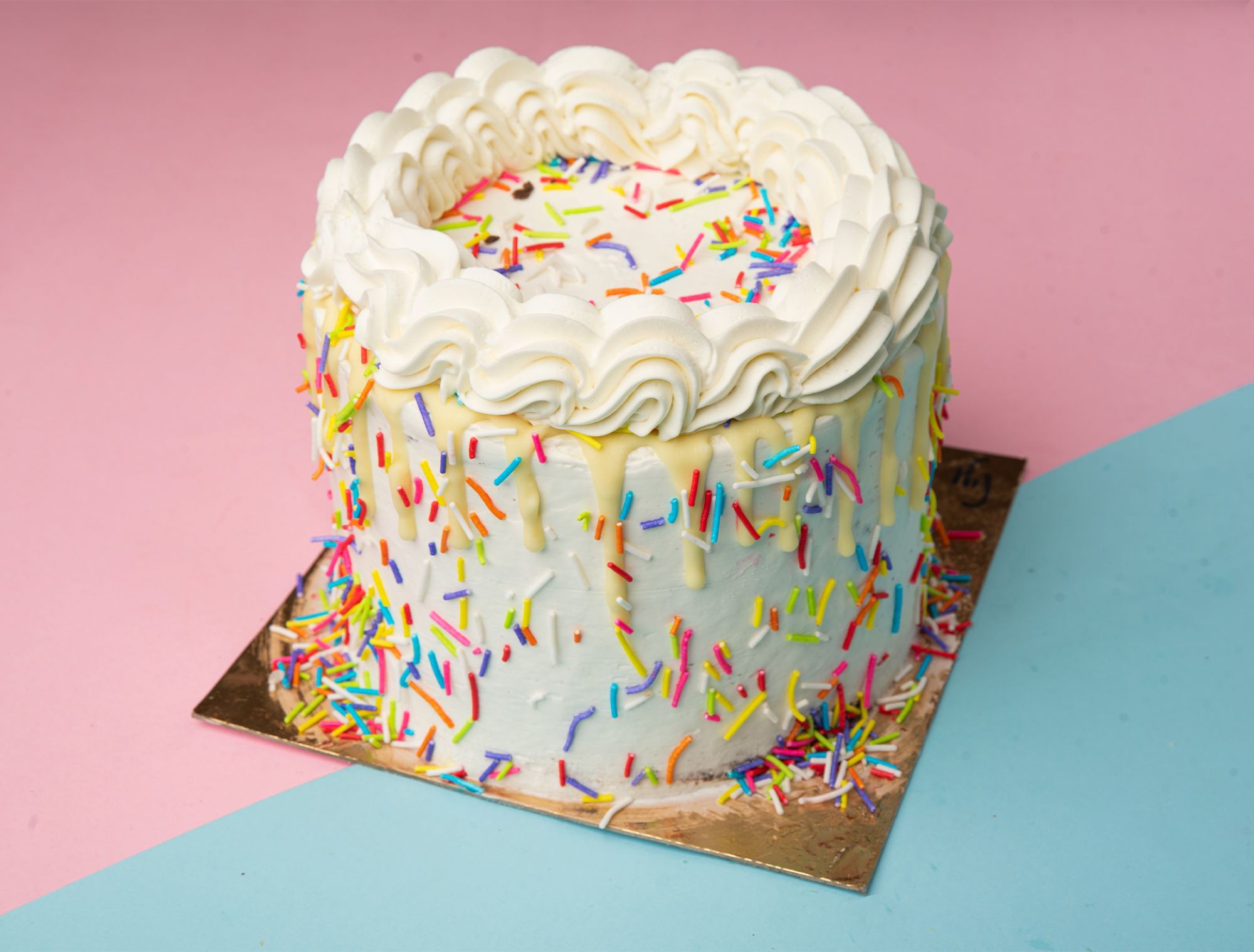 העוגה עטופה בקרם וניל חלק במרקם קרמי ומעוטרת בסוכריות צבעוניות.